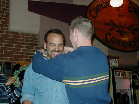 Andy gives Paul his official Boston Marathon completion medallion during a dinner at CBC.