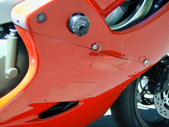 Carefully covered in matching color racer tape. When you get a race bike painted, you make sure it is painted the same color as race tape. :)