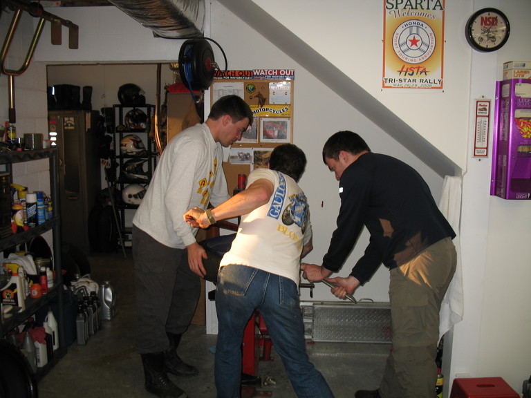 Tom jumps in to help mount the new tire.