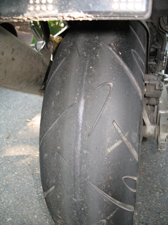 Rear tire after 3238 miles. This tire had 0.0 miles on it before this trip. Yes, Continental is getting a letter. This is unacceptable.