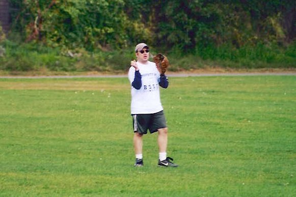 Ed cheers on his team from the outfield.