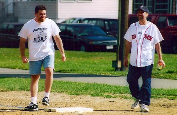 John on 1st base, while a happy Mike coaches him on the finer points of the game.