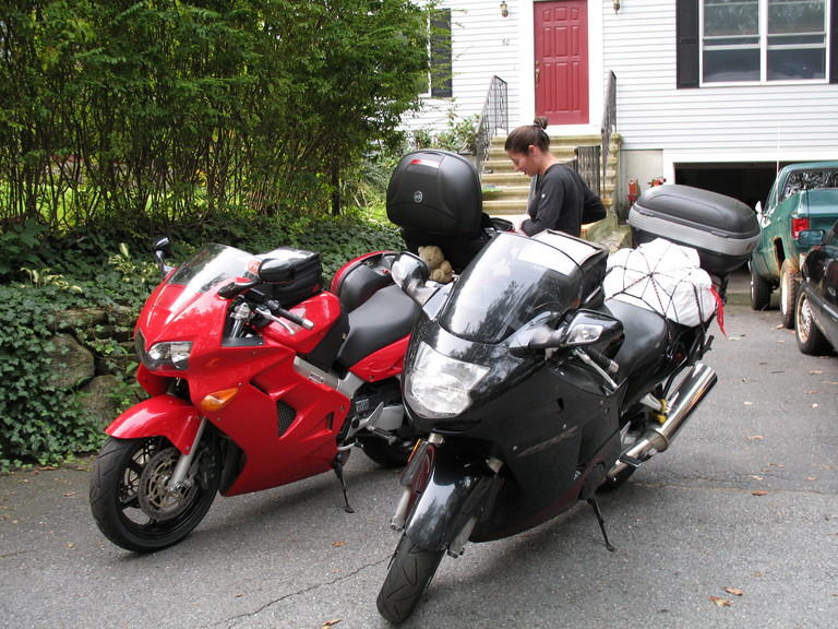 Mary packs up the (new) Givi on her (NEW!!) VFR.