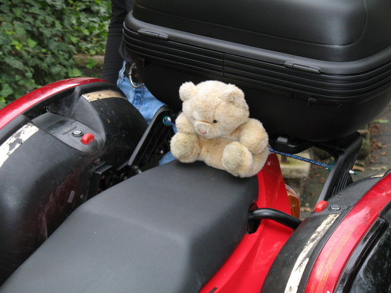 Charlie is strapped in and ready to go.